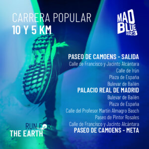 La carrera “Run for the Earth”, organizada por MadBlue con la colaboración de la Comunidad y el Ayuntamiento de Madrid, aspira a demostrar que es posible poner en marcha grandes eventos que aúnan tecnología, innovación, diversión y cultura, siendo respetuosos con el entorno y el planeta. Se trata del evento deportivo dentro de la agenda oficial de la Hispanidad 2023 y contará con la participación de deportistas de élite.